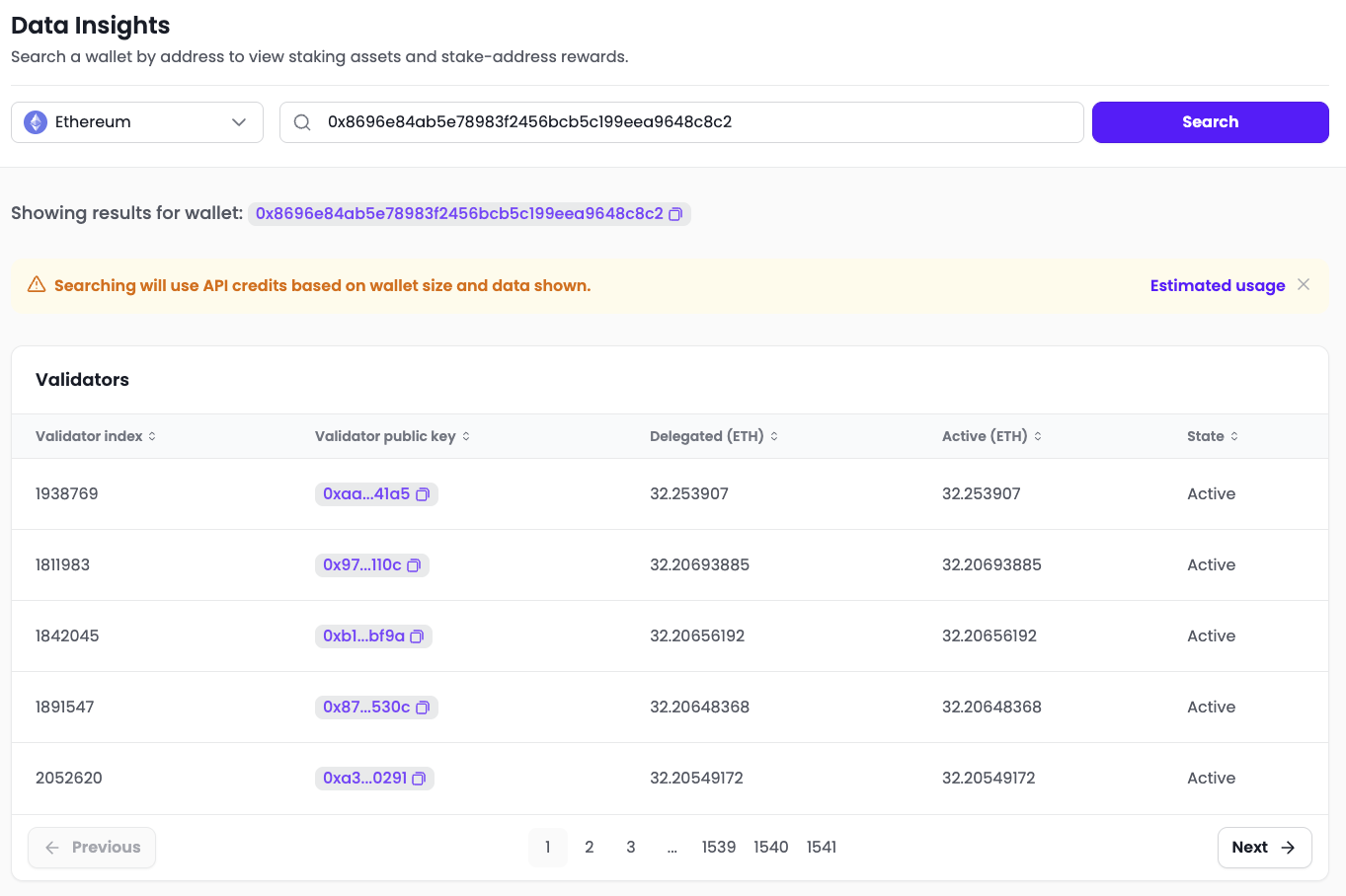 Search any wallet address to view active stakes, validator details, and rewards in one place.