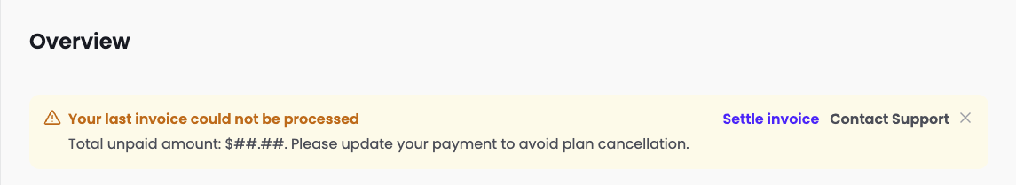 If a payment for an ongoing PayGo subscription or overage charges fails, Stripe will automatically retry the payment for 14 days. If the payment is not completed within this period, your subscription will be cancelled, and your account may be deactivated.