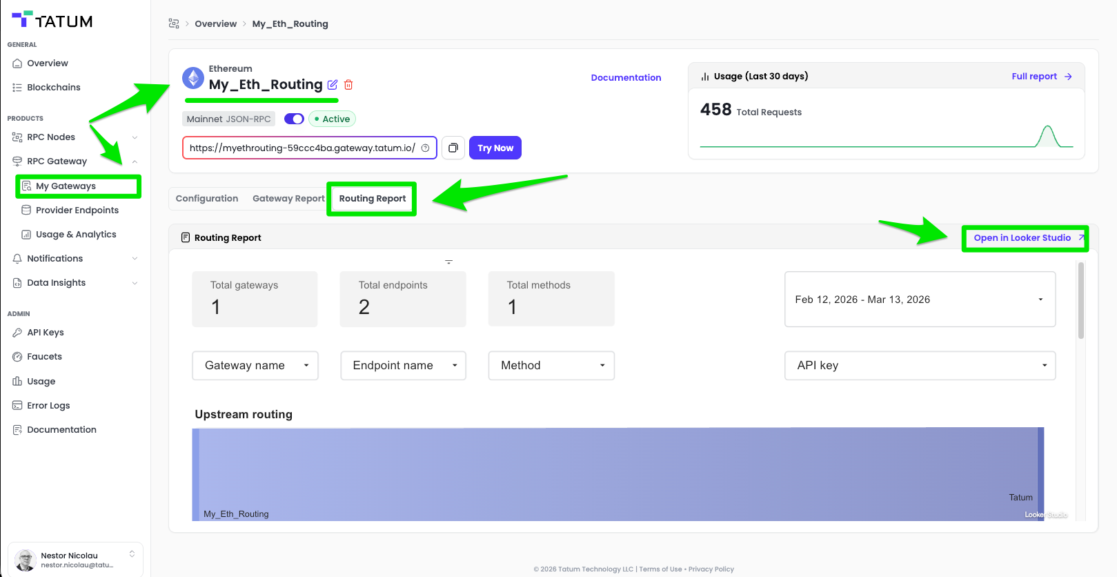 Where to find it: Log in to your Tatum account → Navigate to [RPC Gateway] > [My gateways] > Select one of your gateways → Select [Routing Report]